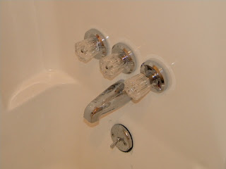 While trying to figure out what was going on, we made a weird discovery - the middle knob, which switches from spout to shower head, also is controlling the flow of water into the faucet. Unless the middle knob is turned just right, the cold water won't switch off. It can be increased or decreased, but not closed off altogether. The hot water won't come on or off until the middle knob is turned just right for it to come out. However, it was time for my friend to hit the road and get home, so I'm just gonna have to live with this little problem until Wednesday. Tomorrow, I'm going to pay a visit to Home Depot and ask the plumbing guy (if he's working) that has helped us a lot what he thinks might be the problem. We're thinking now that it might be the stems were just inserted into the wrong places when it was manufactured, and perhaps switching the middle stem with the cold water stem might, uhm, "stem" the problem. ;)